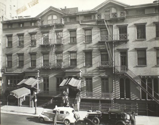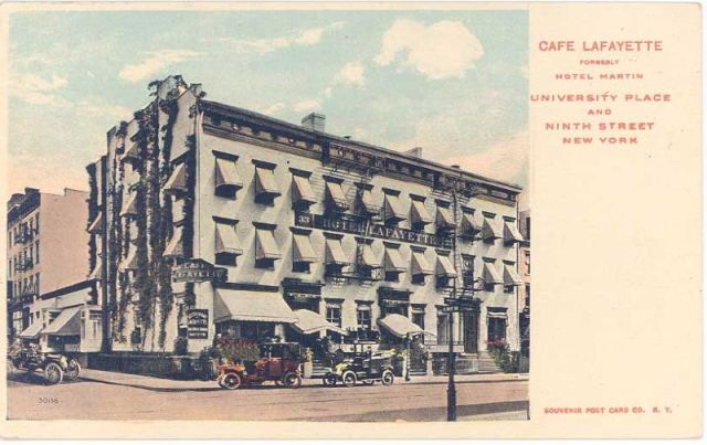 One of White’s stops: the Cafe Lafayette in the Hotel Lafayette at Ninth Street and University Place (above, c. 1910 and below in 1937). White notes that by the time his book came out, the hotel was gone.