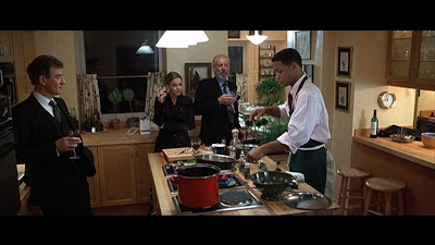 After a man (posing as Sidney Poitier’s son) shows up and charms the well-to-do snobs with various ploys, they decide with self-satisfied glee to do the unthinkable in NYC: to “eat in” rather than spend hundreds of dollars on their regular evening restaurant dinner. (First, though, they must clear the formal dining room table of its clutter and the con man cooks them a masterful feast out of nothing more than what is in the refrigerator.)