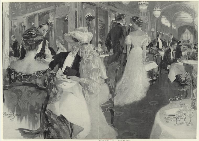 | The restaurant at Astor’s swanky St. Regis Hotel, c. 1905 |