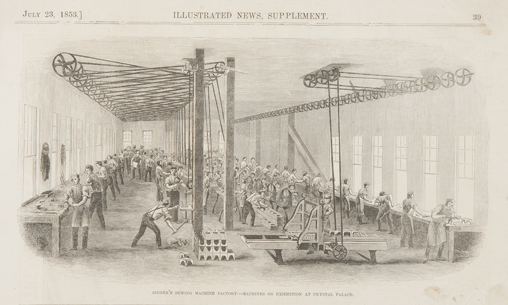 | Singer’s Sewing Machine exhibit. Isaac Merrit Singer displayed his innovative machinery, which he had patented two years before the exhibit in 1851. |