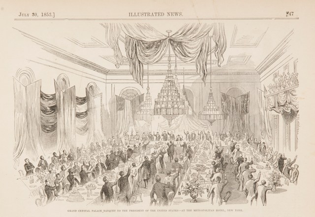| U.S President Franklin Pierce attended the “Grand Crystal Palace Banquet” in NYC. Pierce was present at the opening day ceremonies. Over one million people would see the fair during its run. |