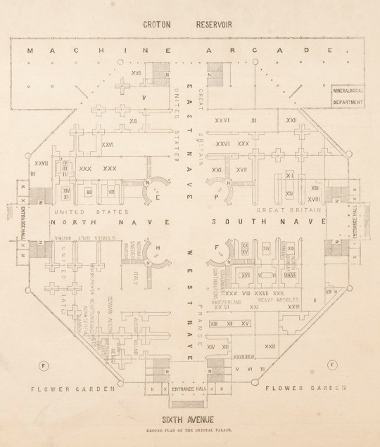| Crystal Palace‘s site, formerly known as “Reservoir Square,” was 1,000 feet by 500 feet. According to Francis’s New Guide to the Cities of New-York and Brooklyn, and the Vicinity, it was “four miles from the Battery, and three and a quarter from the City Hall, but most conveniently located with reference to travel. The depots of the Sixth Avenue, the Eighth Avenue, and the Harlem Railroads, and the upper termini of some dozen lines of stages, are in the immediate neighborhood; so that, for five or six cents one may reach the place from any part of New-York, and, with the addition of ferriage, from the remotest sections of Brooklyn, Williamsburg and Jersey City, without so much as two minutes’ walking.” |