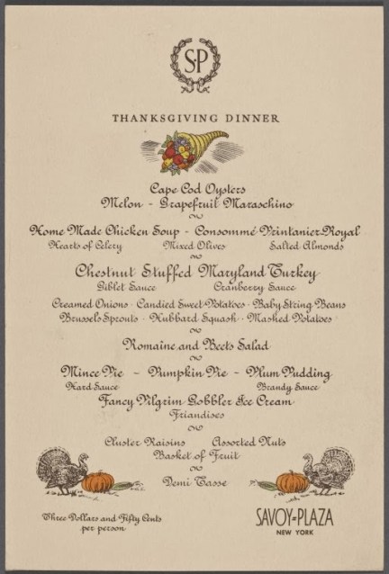 Thanksgiving at the (no longer extant) Savoy-Plaza Hotel at 5th Avenue and 59th Street served up its grapefruit “maraschino.” The hotel had opened in 1927, and in the modern age, its pared down menu reflected the stream-lined approach to menu offerings.