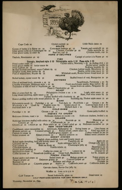 At the turn of the 20th century, the famed Plaza Hotel offered an 1899 Thanksgiving menu that was chock full of choices. Among the items on its brimming-over menu were squab, partridge and grouse, along with chicory salad, chiffonade, or just plain lettuce salad; for sweets how about “Ice St. Jacques,” mince pie, or the always delightful “national sorbet”?