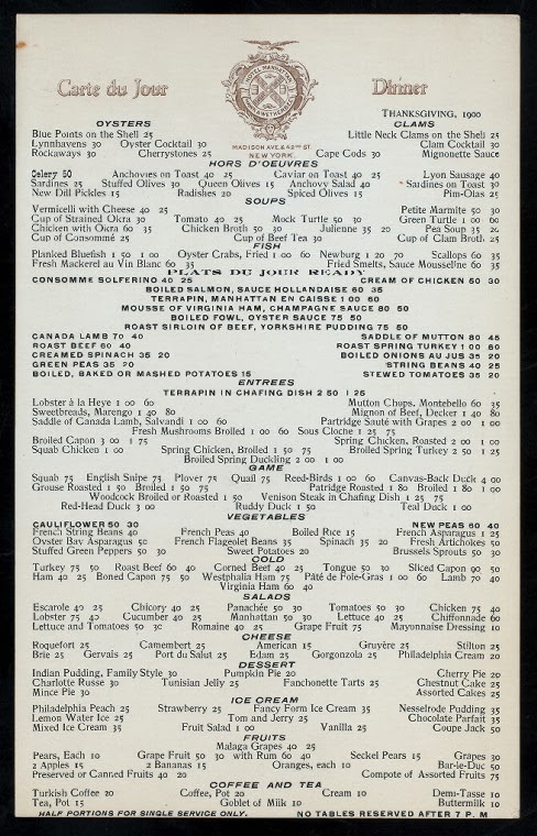 In 1900, the Hotel Manhattan also offered a mind-numbing number of choices. Entrees included lobster, mutton chops, sweetbreads, partridge, chicken, and yes, also turkey. But turkey, as seen on many of these menus, had not been established as the only holiday dish to serve.