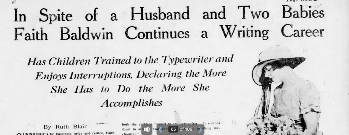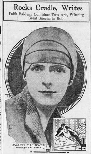 Baldwin’s father also had a love of writing (he published some of his work in Frank Leslies’s). But it was clear to the whole family that it was Faith Baldwin who was the writer of the family; her early interest in writing was just one reason she was considered a prodigy. (She learned to read at the age of 3.) But the family did not permit her to be coddled and worshiped. “I was was permitted to astonish and gratify the family,” Baldwin told Nunnally Johnson in a 1924 profile of her, ” but no more.”