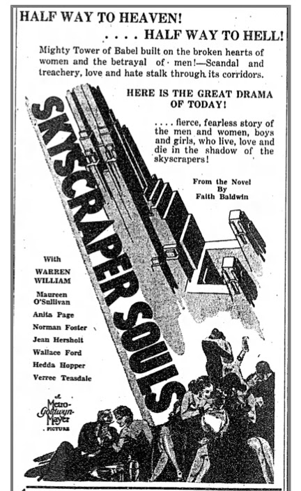 The 1932 film “Skyscraper Souls,” based on Baldwin’s novel, Skyscraper, typified this attitude. Both novel and film were cautionary tales for women eager to “make it” in the big city.