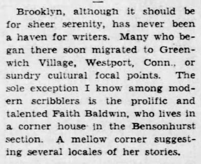 And Brooklyn, her home and the setting for many of her novels, remained close to her heart. In 1935, the popular columnist O.O. McIntryre singled out Baldwin and her beloved Brooklyn as worthy of noting: