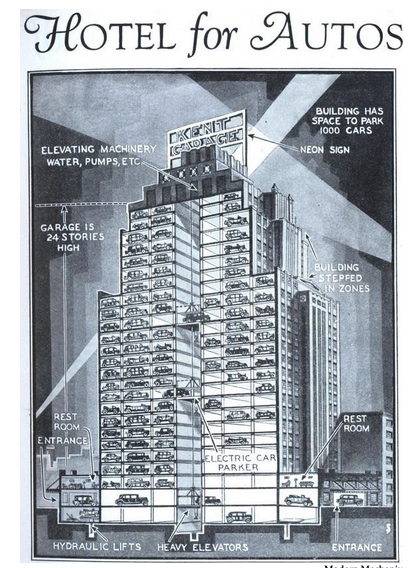 Soon even automobiles had places to rest in the city when not in use. The “hotel for auto” (also called an “Auto Inn”) made its appearance. You can read more about those here.