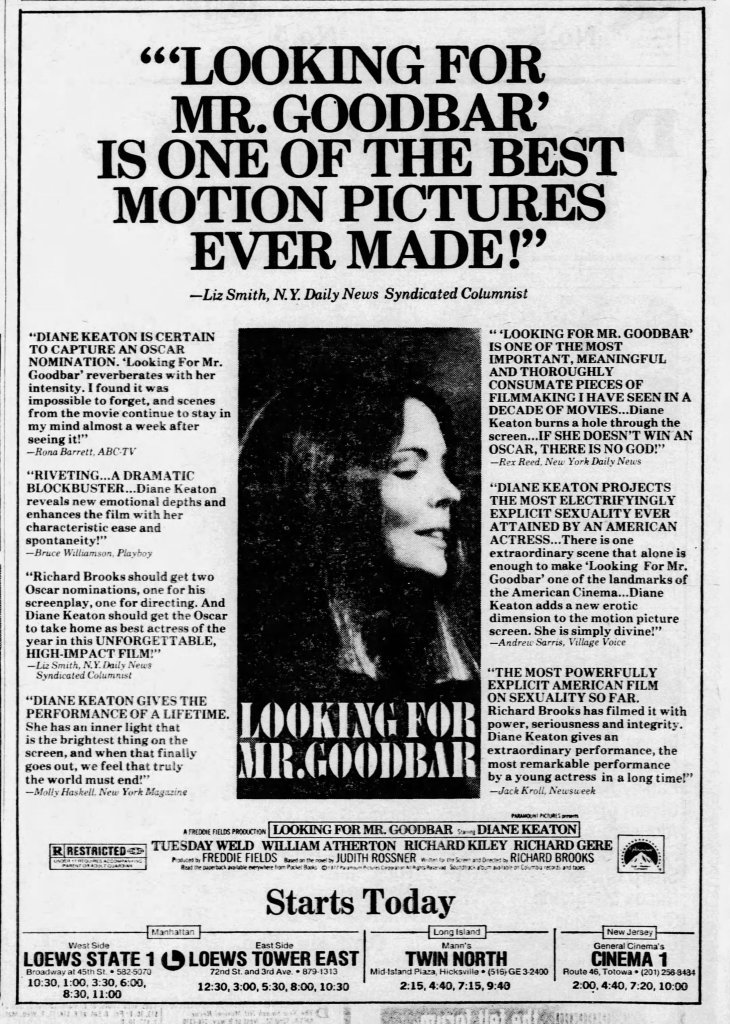 Keaton would return (cinematically) to her old stamping ground when she starred in the 1977 film, Looking for Mr Goodbar. The film, based on a 1975 book by the same name by Judith Rossner, imagined the larger context to a real-life incident: the murder of Roseann Quinn, a 28 year old single woman who lived on the UWS and was killed by a man that she reportedly met (“picked up”) at an UWS bar called W.M. Tweeds (opened in 1968 and after Quinn’s death renamed All State’s Cafe).